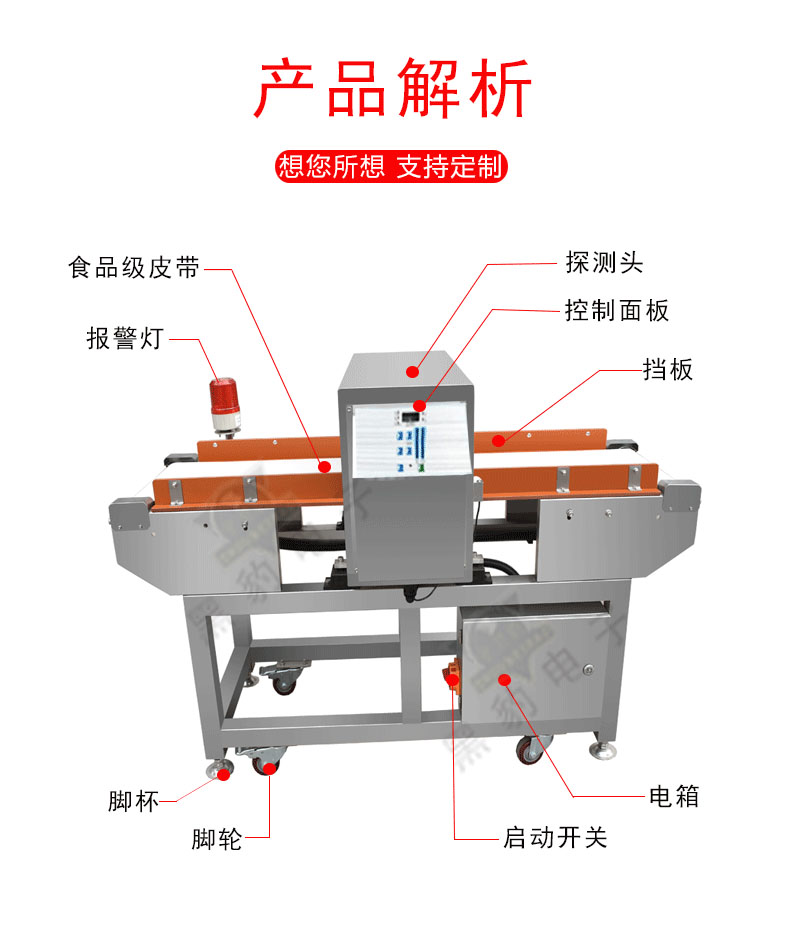 | 报警方式 | 检测到金属异物自动停机,并输出12V蜂鸣器警报音警示(可定制多种剔除装置:翻板、拨杆、推杆、喷气等) | |||||||
