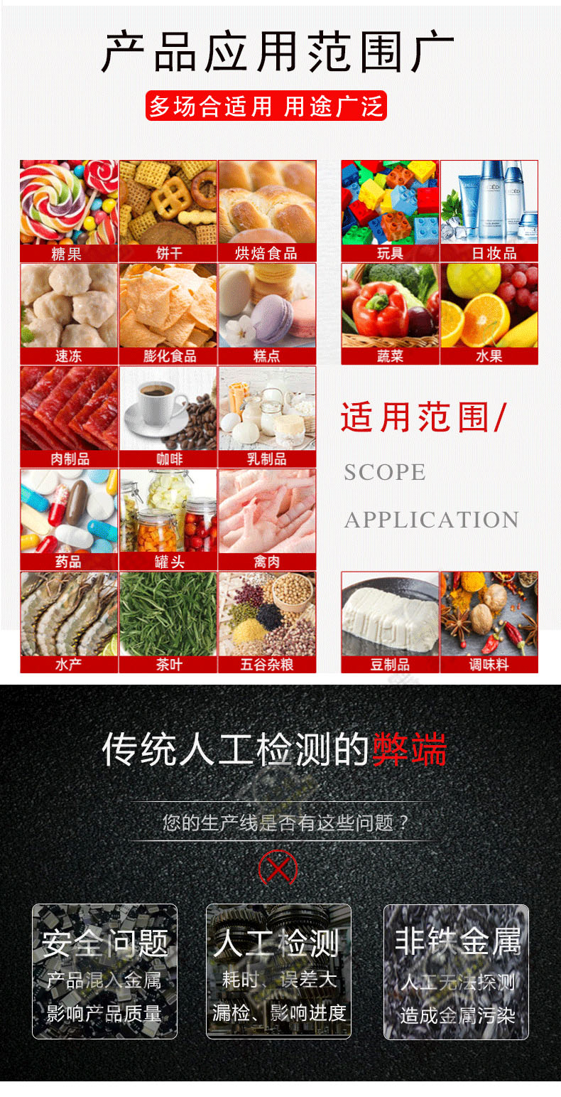 食品、药品、玩具、服装、制鞋、化工、皮革、针织等行业产品,用于检测各类产品或原料在生产加工过程中混入的金属杂质。如:铁及非铁磁性金属物品(铁、铜、铝、不锈钢等常见金属都可检测出)。