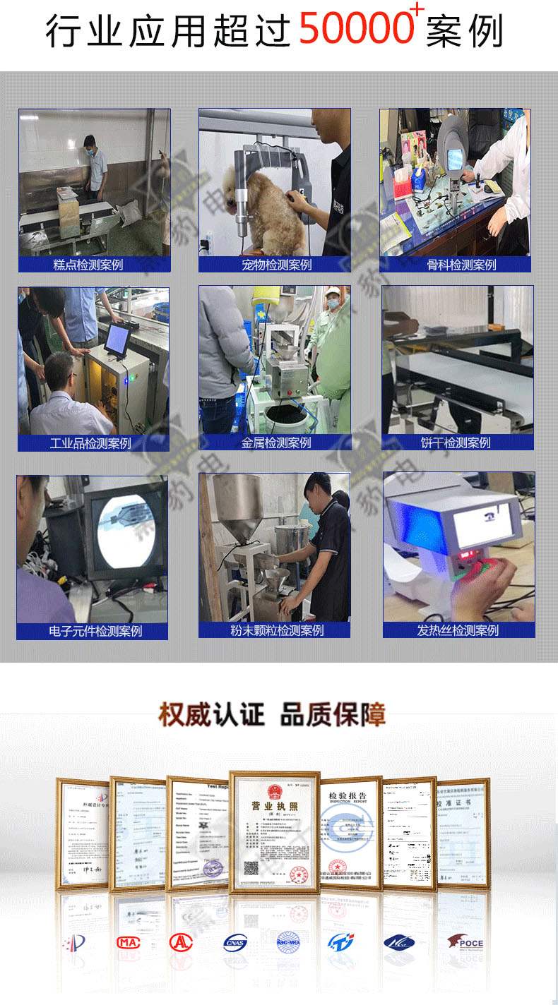 | 注:常规机器均有现货供应,灵敏度参数为空机全方位测试值,实际检验产品时参数视检测物不同可能会降低。机器的龙门口径大小直接影响到机器的灵敏度性能。即:口径越小,所对应的检测精度(即灵敏度)就越高,用户可根据检测精度要求改变产品包装大小以及选购较小的检测口径,可获得更佳的检测效果。 | ||||||||
