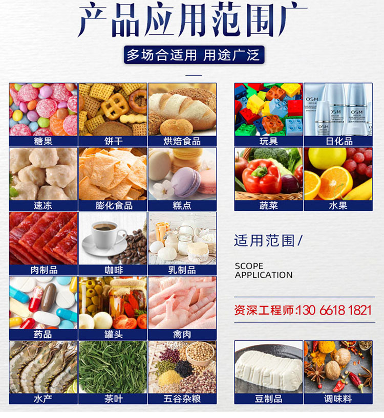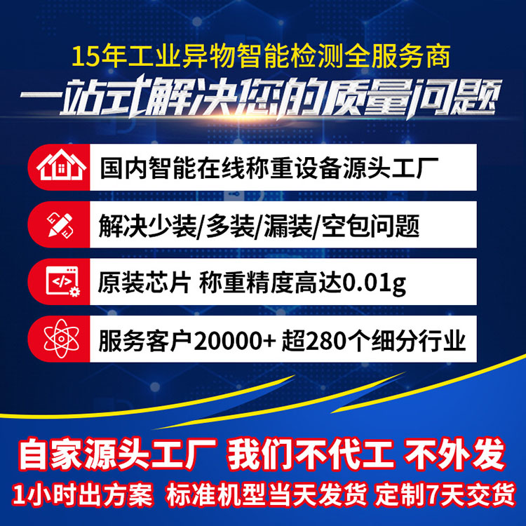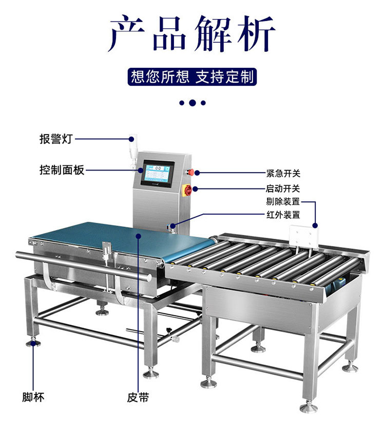 本产品适用于检测小重量物品单个重量是否合格,广泛应用于电子、制药、食品、饮料、保健品、日化、轻工、农副产品等多行业。尤其适用于制药保健品行业检测片剂药品是否少粒、多粒;粉末袋装药品是否缺袋、多袋;液体状药品重量是否达到标准要求;药品附件缺失检测(如说明书、干燥剂等)。